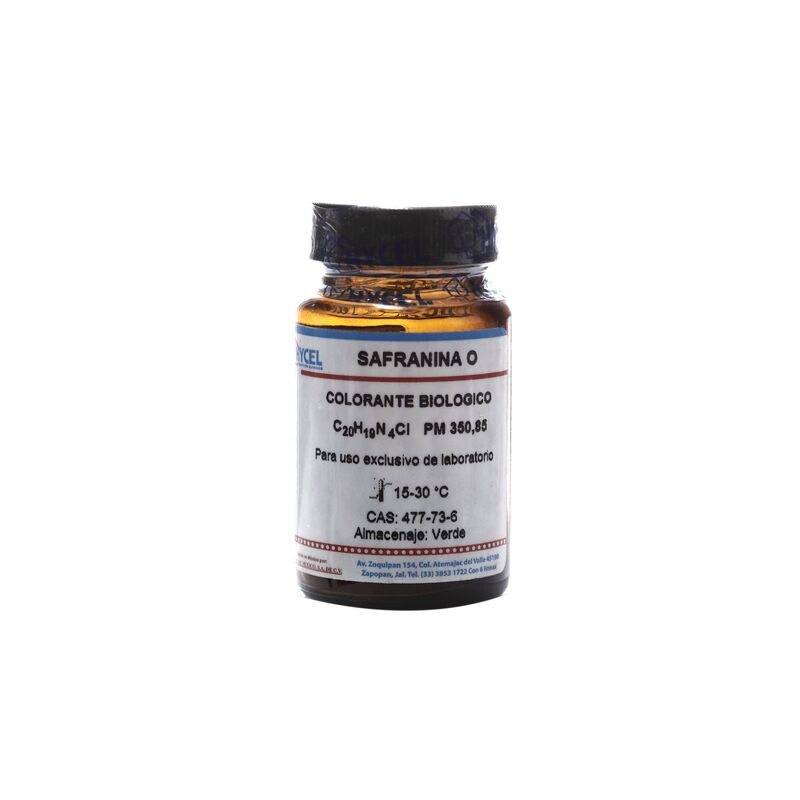 Safranina O IC 50240. Colorante biológico. Polvo amorfo color rojo. Reacción verde en ácido sulfúrico concentrado. Reacción azul en ácido sulfúrico diluido. Número CAS: 477-73-6. Frasco de 25g.