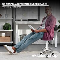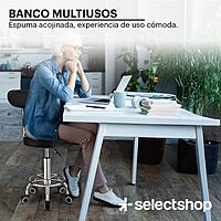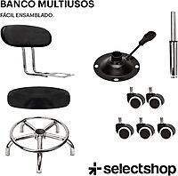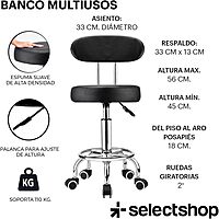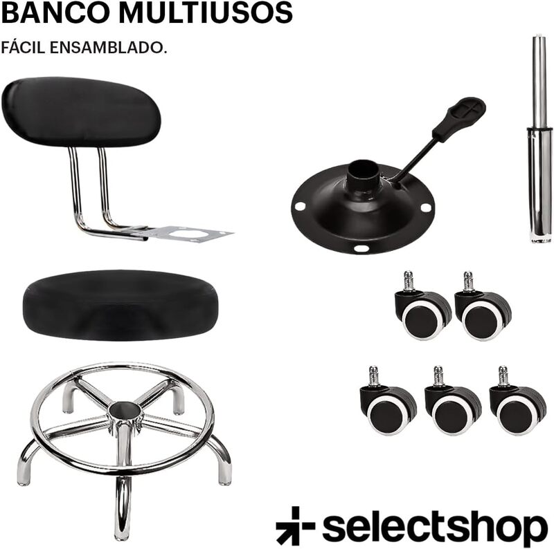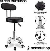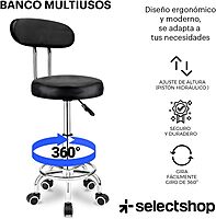 El banco multiusos de Selectshop puede ser utilizado en el hogar, estética, barbería, laboratorio, estudio de tatuajes, oficina o dentista. Te ayudará a realizar tu trabajo de forma más cómoda y fácil. - Desplázate sentado hacia donde tú quieras, gracias a que su base de estrella cuenta con 5 ruedas giratorias a 360 grados. - Altura regulable con sistema de palanca hidráulica, así podrás ajustarlo de acuerdo a tus necesidades. - Asiento cómodo y fácil de limpiar. Base de acero cromado de alta durabilidad y resistencia. - Su diseño moderno combina con cualquier estilo de habitación.