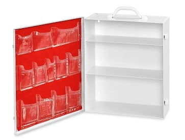 Equipe de acuerdo a sus necesidades de seguridad. Los compartimentos de vinil en la puerta brindan acceso rápido a las vendas y cinta. Acero pulvirrevestido. Instalación en pared. Use con Repuestos para Kit de Primeros Auxilios, se venden por separado.