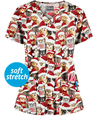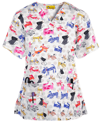 La blusa médica con cuello en V y estampado presenta "". La parte superior tiene cuello en V con ribete negro, pinzas en el busto, 3 bolsillos; 2 bolsillos de parche delanteros con 1 bolsillo interior en las aberturas derecha y lateral. La longitud aproximada de Medium es 27 1/4 ". El contenido de la tela es popelina de poliéster / spandex 94/6.